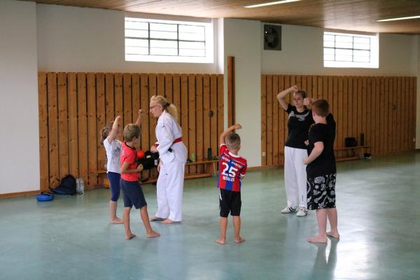 Nach einer kurzen Kennenlernrunde bei der sich sowohl die Trainer als auch die Kinder untereinander vorstellten, begann das Training. Die Trainer hatten es sich zum Ziel gesetzt den Kindern alle Aspekte des Taekwondo zu präsentieren, wobei der Spaß nicht zu kurz kommen sollte. Neben Übungen zur Balance und das Erlernen von Kicks und Blocks wurde spielerisch Koordination und Ausdauer trainiert. Trotz anfänglicher Schwierigkeiten meisterten alle Kinder mit der Unterstützung der Trainer, die fehlerfreie Ausführung der Kicks auf die Pratzen. Abschließend durften die Kinder das Erlernte ihren Eltern zeigen.